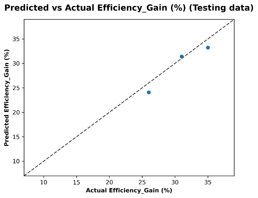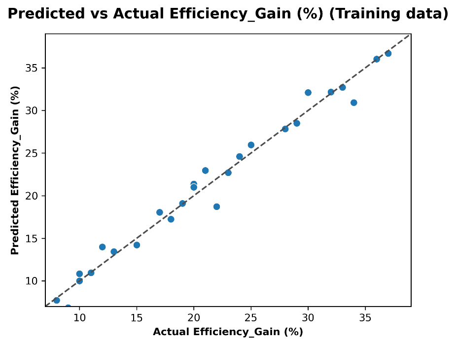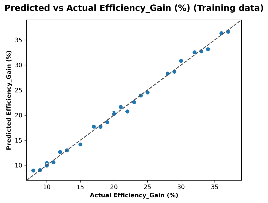 Figure 3 shows a linear regression plot comparing the predicted and actual performance gains (%) using the training data. The points are closely aligned on the diagonal line, indicating a strong fit between the model’s predictions and the actual results. This indicates high model accuracy in estimating performance gains based on process and automated parameters.