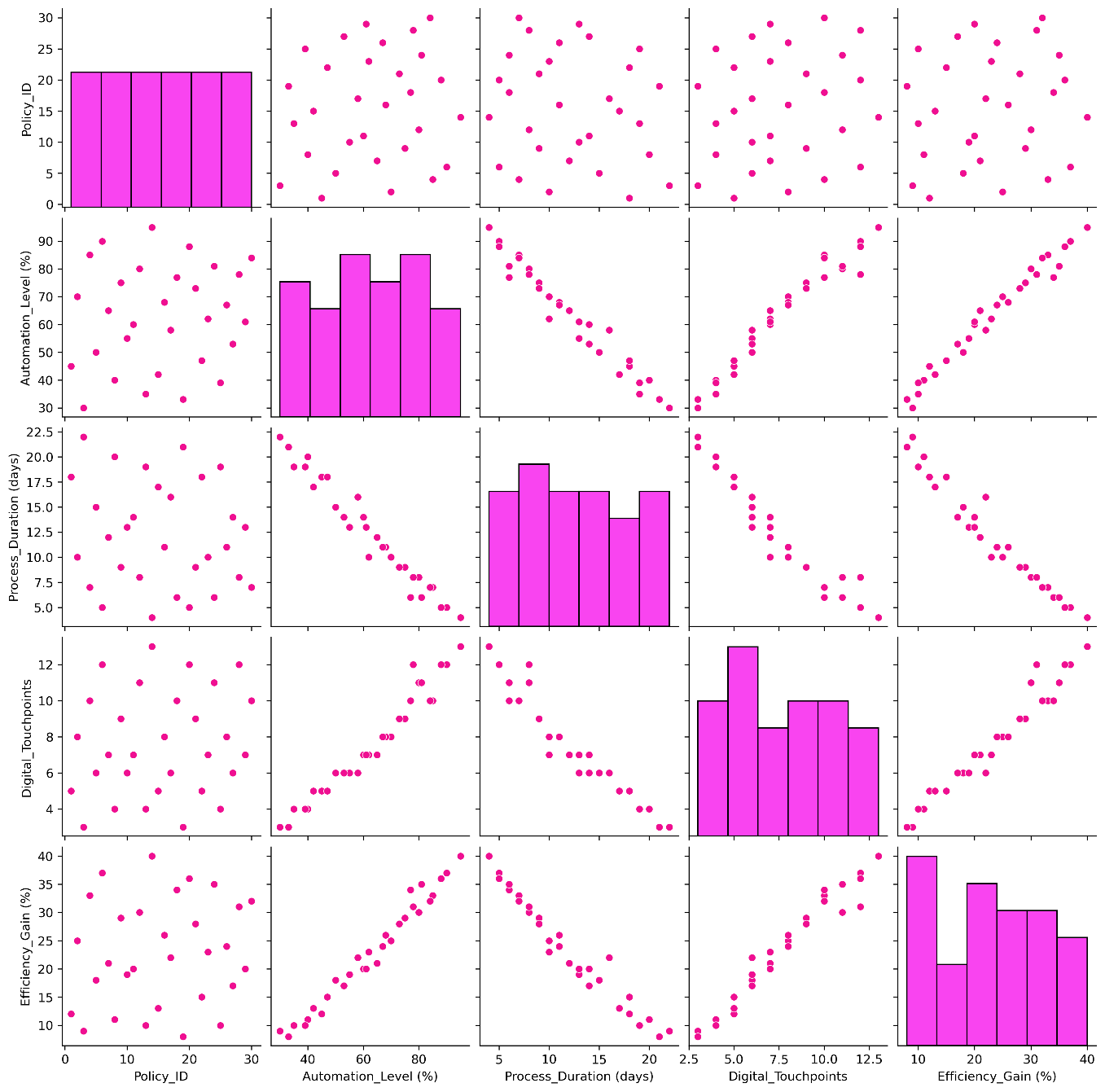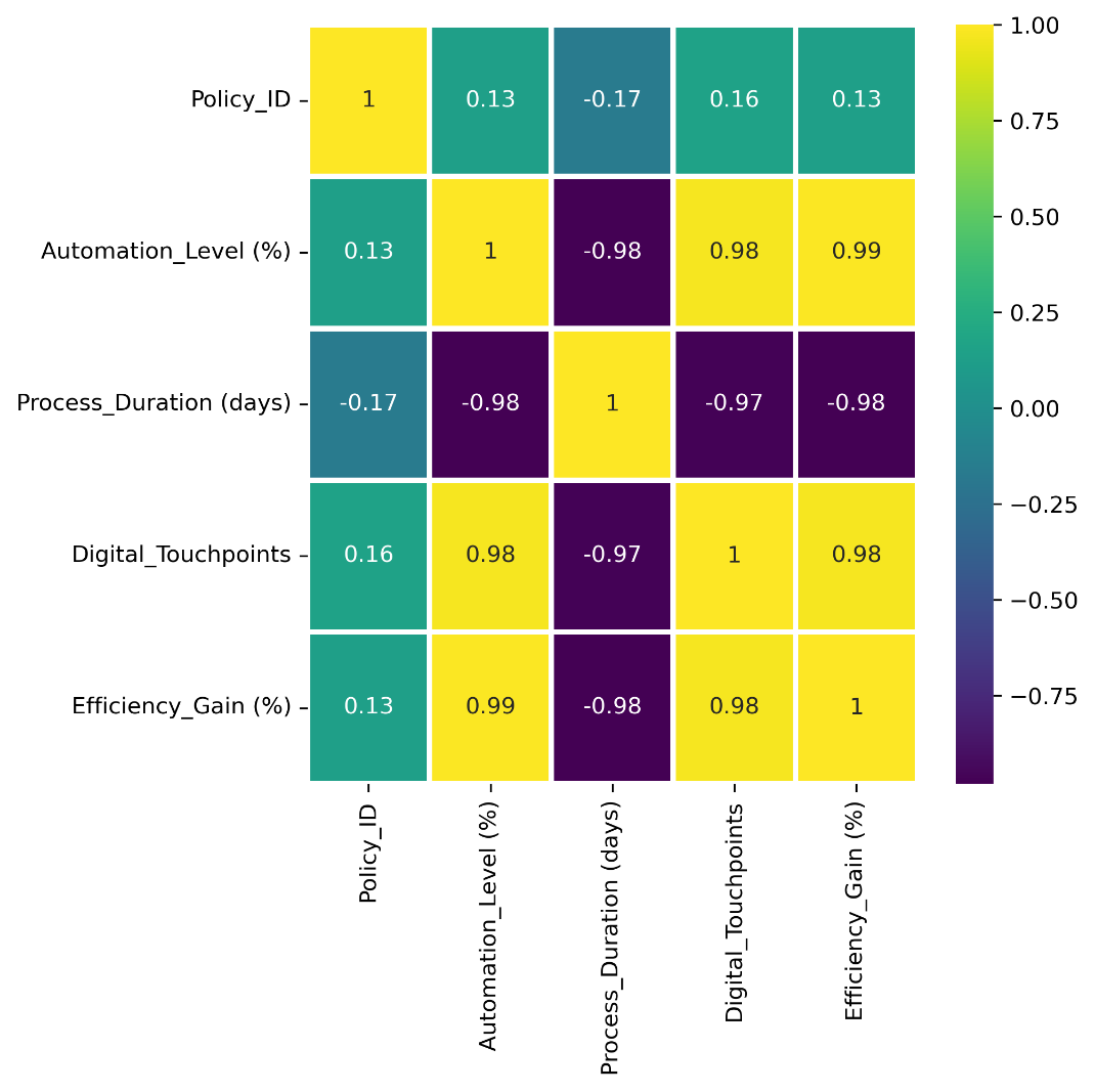 | Policy_ID | Automation_Level (%) | Process_Duration (days) | Digital_Touchpoints | Efficiency_Gain (%) |