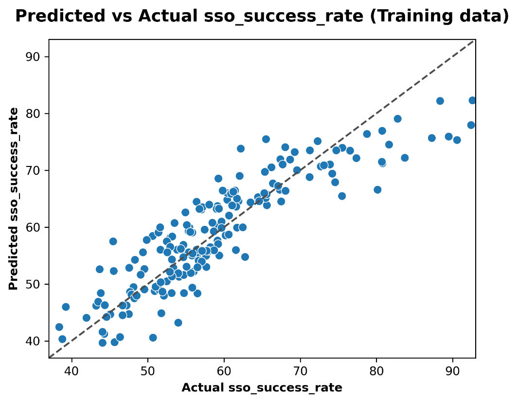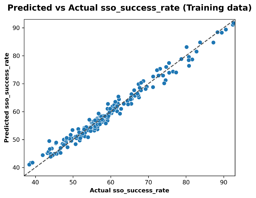 Figure 3 shows a scatterplot comparing predicted and actual SSO success rate values for the training data using a linear regression model. Each point on the plot represents an observation. The dashed diagonal line represents the best-case scenario where the predicted values exactly match the actual values (i.e., correct predictions). The cluster of points surrounding this line indicates that the linear regression model performs reasonably well in capturing the trend of the data. However, there is some significant scatter, particularly at the lower and upper limits of the actual SSO success rate, indicating that the model tends to underestimate at high success rates and overestimate at low ones. This pattern indicates regression to the mean, which is a common limitation in linear models. Despite this, the general alignment indicates that the model has captured meaningful relationships between features and the response variable. Although there is room for improvement in prediction accuracy, especially at extremes, the figure confirms the utility of the model in predicting SSO success rates. This insight could prompt further refinement of the model, perhaps by incorporating nonlinear techniques or additional features to better capture the complexity of the system.