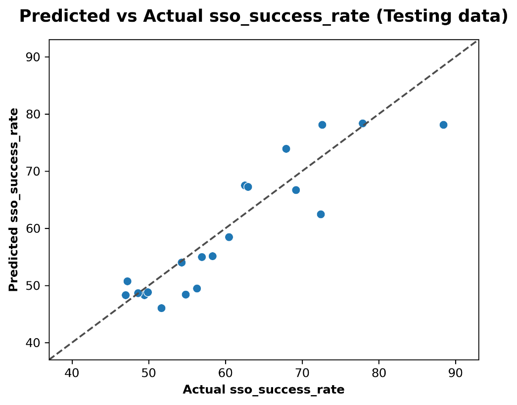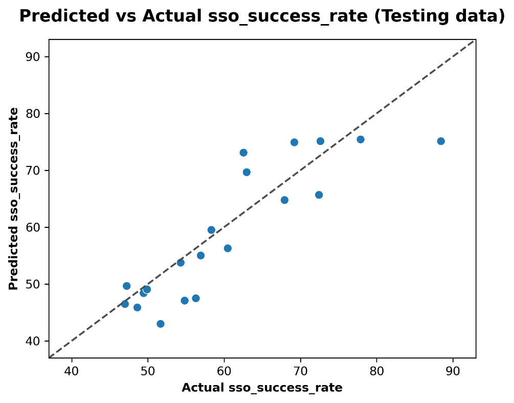Figure 6 This scatterplot illustrates how well the random forest regression model predicts the SSO success rate on the test dataset. Each point represents a comparison between the actual and predicted values. The dashed line represents the best predictions. The proximity of most points to this line indicates that the model provides accurate results with low prediction errors.