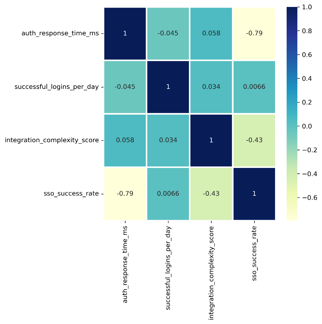 The heat map in Figure 2 illustrates the relationship between key process parameters and response metrics within an authentication system. Each cell represents the Pearson correlation coefficient between the two variables, ranging from -1 (perfect negative correlation) to +1 (perfect positive correlation). The most significant relationship is between auth response time ms and sso success rate, which shows a strong negative correlation of -0.79. As authentication response time increases, the SSO success rate decreases significantly, indicating that performance issues can greatly impact user success. In contrast, successful logins per day shows almost no correlation with any other variable, indicating that it can be affected by external factors not captured here. Integration complexity score has a modest negative correlation (-0.43) with sso success rate, indicating that more complex integrations are associated with reduced SSO success. However, it has a much weaker positive correlation with the other variables.