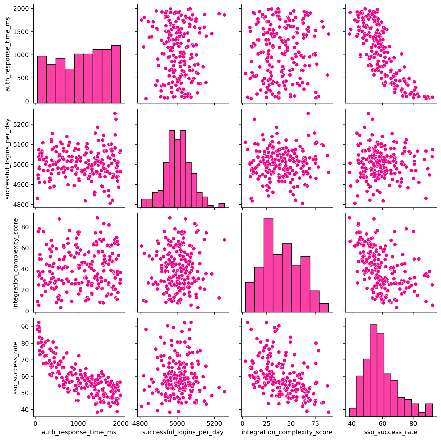Figure 1 shows pairwise scatter plots of four metrics: auth response time (ms), successful logins per day, integration complexity score, and SSO success rate. Each diagonal plot presents the distribution of a single variable through histograms, while diagonal plots show the relationships between pairs of variables. auth response time vs SSO success rate: There is a clear negative correlation; as response time increases, SSO success rate decreases. This indicates that slower authentication often leads to lower success rates. auth response time vs integration complexity: No strong linear pattern is evident, indicating that response time is not directly dependent on integration complexity. Successful logins per day: Most scatter plots involving this metric show no significant correlation, meaning that the number of user logins remains fairly constant regardless of response time, complexity, or SSO success rate. Integration complexity vs SSO success rate: There is a slight negative trend, indicating that more complex integrations may reduce SSO reliability, although the variability is high. Distributions: The histograms indicate that the authentication response time is very widespread, logins per day are around 5000, the integration complexity has a moderate spread, the SSO success rate shows a right-skewed distribution, and most systems achieve 50–70% success.
